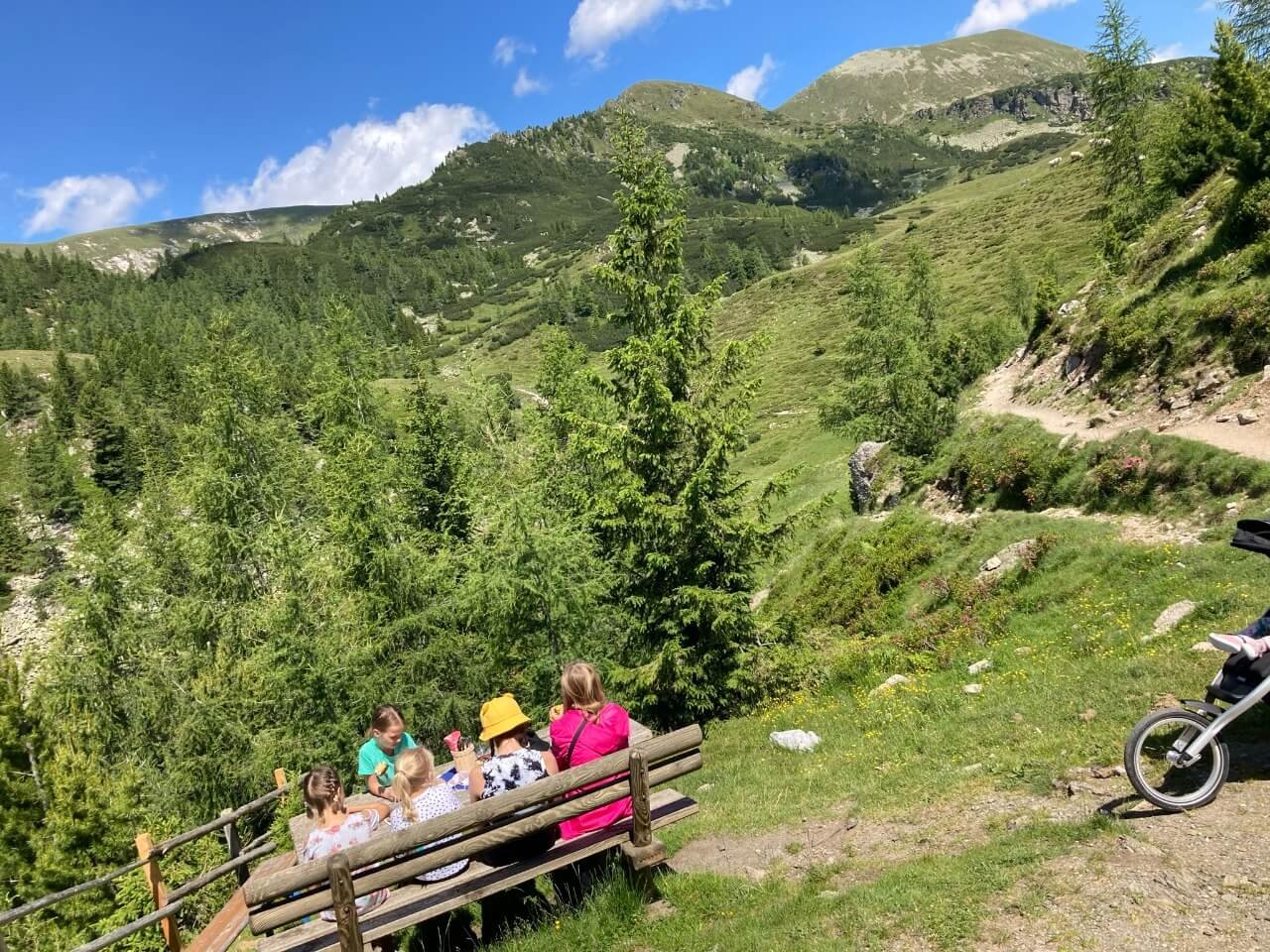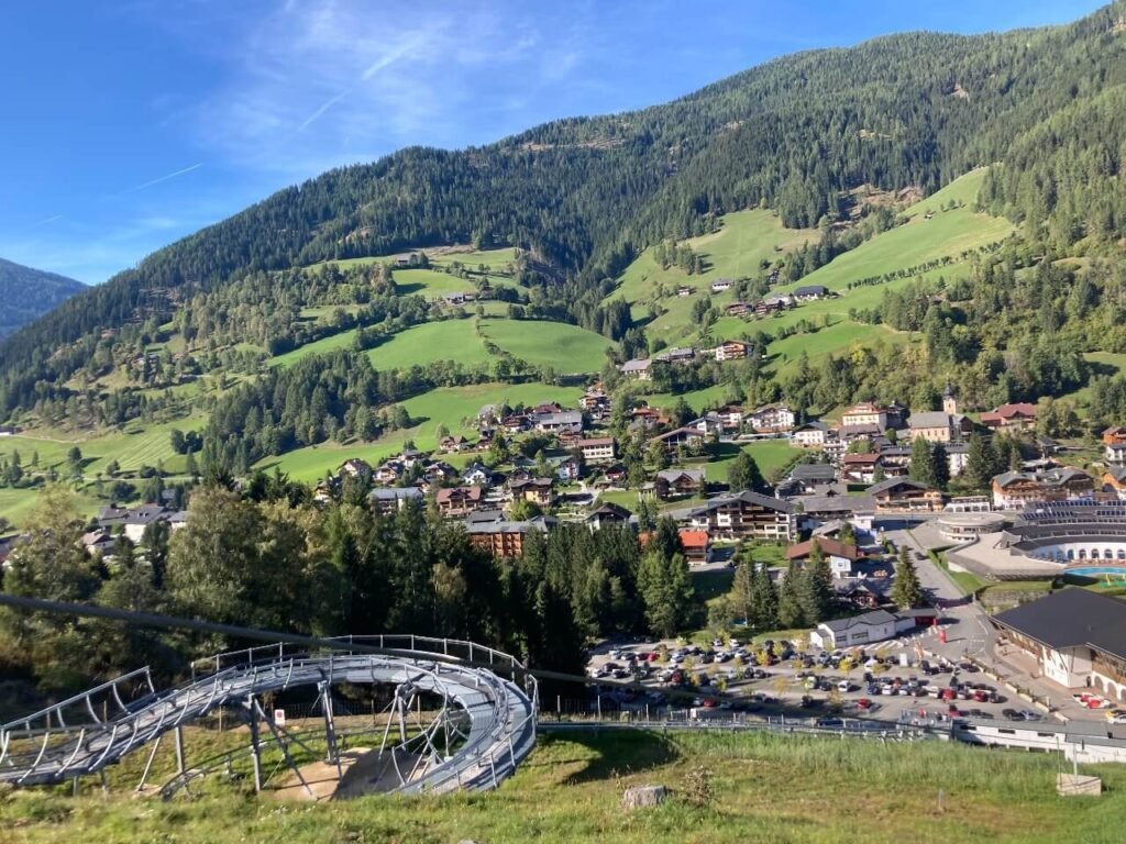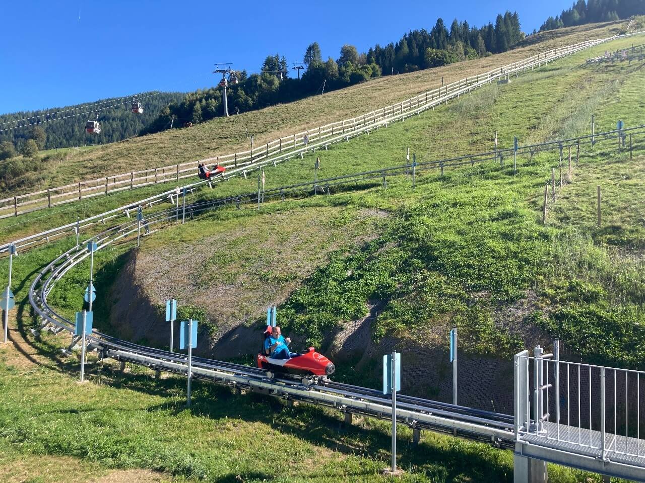 Horní stanice leží na hřebeni, odkud se otevírá nádherný výhled do údolí i na okolní alpské vrcholky. U lanovky najdete restauraci, čisté toalety a prodejnu Intersport. Kabinka je prostorná, takže bez problémů převezete kočárek, případně i kolo (za 3 €).