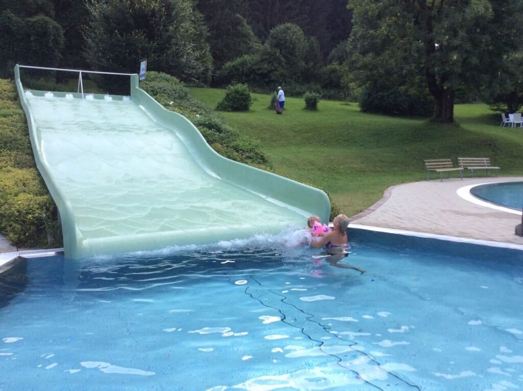 - velký plavecký bazén se skluzavkou, vodotryskem a perličkami (spouštěné v hodinových intervalech).