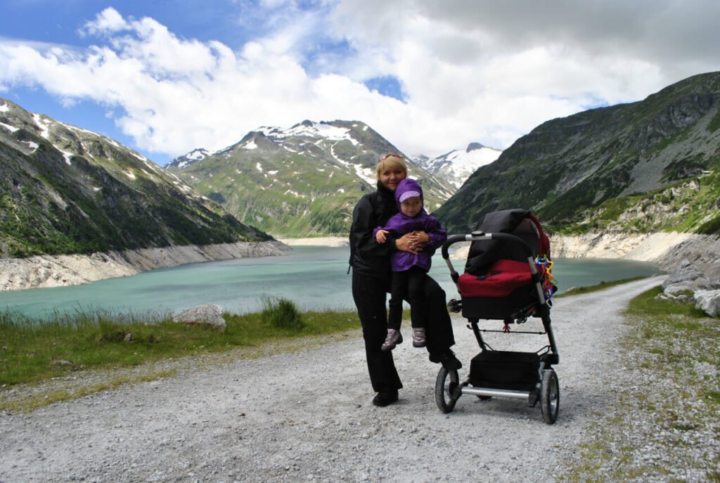 Cestou kolem přehrady dorazíte na rozcestí směrem k Jagasteighütte (mapa). Kočárek je potřeba nechat dole a vyrazit pěšky – cesta je strmá, většinou po kamenných schodech. Odměnou vám ale bude fantastický výhled na přehradu a okolní vrcholy.