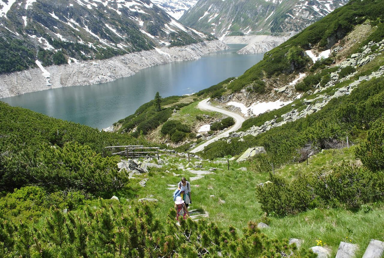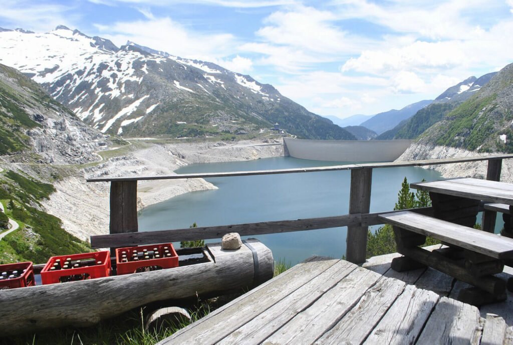 Po příjezdu na parkoviště se vám otevře krásný výhled na okolní hory i monumentální přehradní jezero Kölnbreinspeicher. Určitě doporučujeme zajít přímo na hráz – pohled do údolí i na masivní betonovou stěnu je dechberoucí.